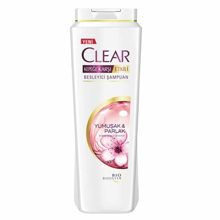 این تصویر یک بطری شامپو ضد شوره Clear را نشان میدهد که برای موهای نرم و درخشان طراحی شده است.