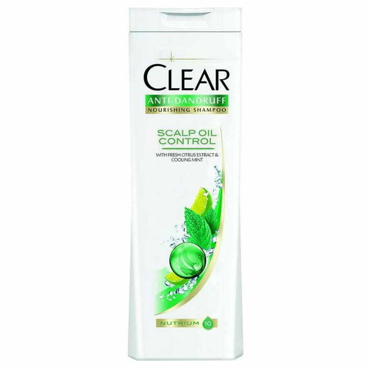 تصویر یک بطری شامپو ضد شوره Clear با عنوان "Scalp Oil Control" را نشان میدهد که برای کنترل چربی پوست سر طراحی شده است.